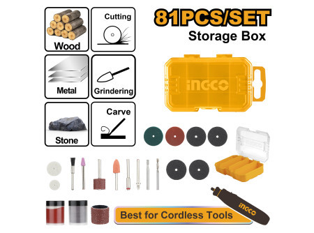 Veľkosť upínacieho hriadeľa: 3,2 mm (1/8"), 81 kusová univerzálna súprava: 4 ks brúsne pásy, 2 ks brúsne kamene, 1 ks nylónový kefa, 1 ks vŕtací hriadeľ, 2 ks upínacie hriadele (mandrel), 2 ks impregnované kotúče, 1 ks vysokorýchlostná rezná hlava, 2 ks leštiace kotúče, 3 ks vystužené rezné kotúče, 1 ks leštiaci materiál, 36 ks rezné kotúče, 25 ks brúsne kotúče, 1 ks brúsny valček s upínacím hriadeľom, v kartónovej škatuli.