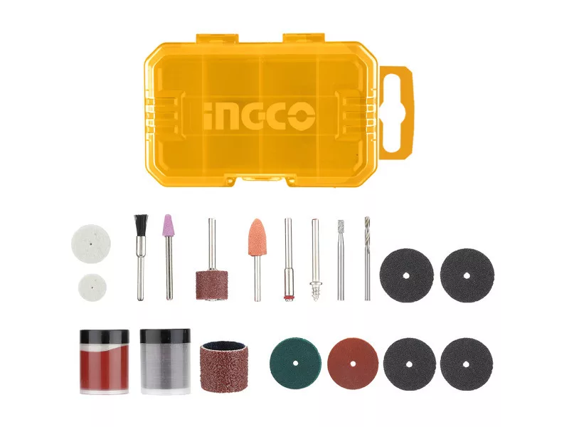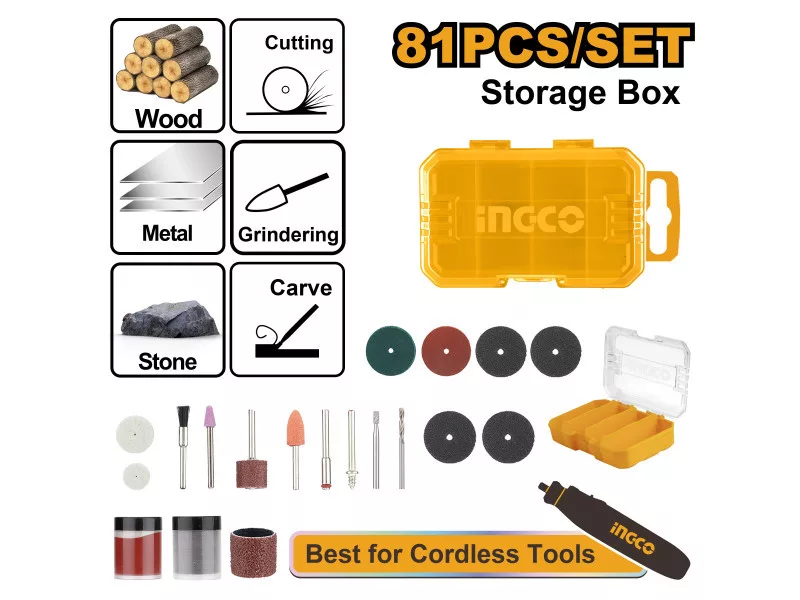 Veľkosť upínacieho hriadeľa: 3,2 mm (1/8"), 81 kusová univerzálna súprava: 4 ks brúsne pásy, 2 ks brúsne kamene, 1 ks nylónový kefa, 1 ks vŕtací hriadeľ, 2 ks upínacie hriadele (mandrel), 2 ks impregnované kotúče, 1 ks vysokorýchlostná rezná hlava, 2 ks leštiace kotúče, 3 ks vystužené rezné kotúče, 1 ks leštiaci materiál, 36 ks rezné kotúče, 25 ks brúsne kotúče, 1 ks brúsny valček s upínacím hriadeľom, v kartónovej škatuli.