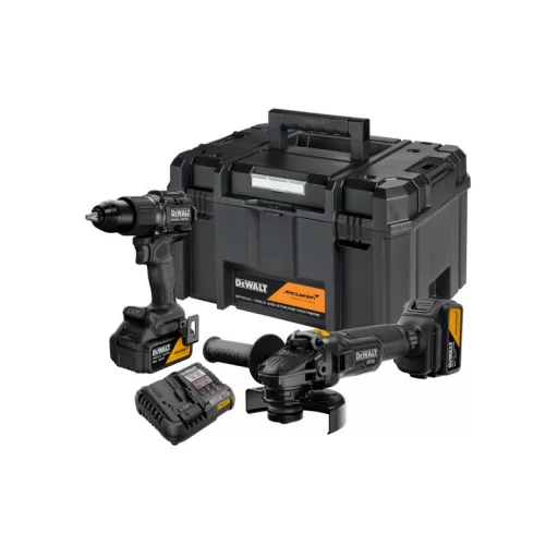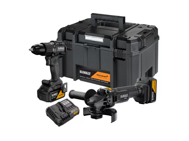 A készlet tartalma: DCD86M 18 V szénkefe nélküli Mclaren ütvefúró-csavarozó, DCG45M 18V szénkefe nélküli McLaren sarokcsiszoló , 2 × DCB184 5 AH akkumulátor, DCB1104 4 amperes töltő, T STAK™ koffer.