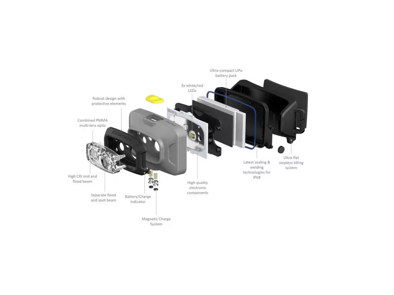 - Možnosť upevnenia na prilbu s gumovým čelenkovým remienkom alebo držiakom na prilbu a adaptérom (príslušenstvo)
