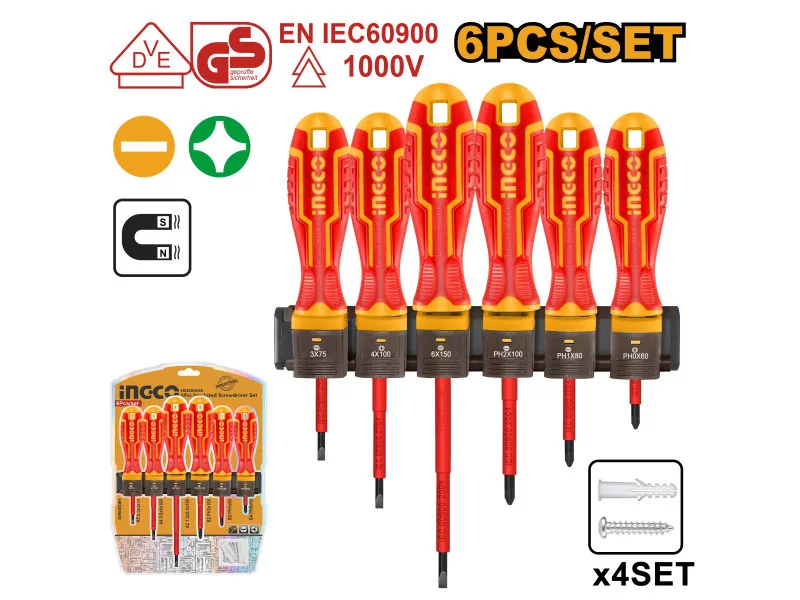 Obsah balenia: 6 izolovaných skrutkovačov, držiak z hliníka, 4 skrutky, 4 hmoždinky, v blistri