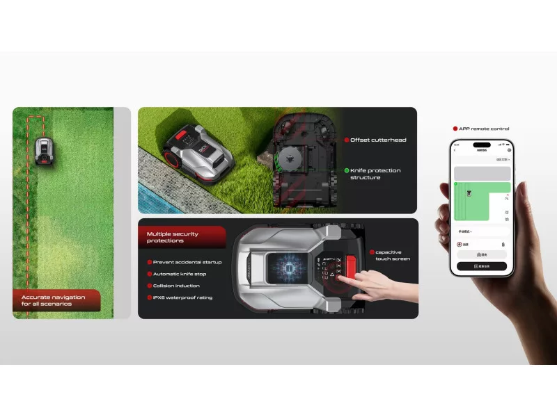 - Multi-Zone Management - až 8 zón s možnosťou samostatného nastavenia: výška kosenia, smer, plánovanie.