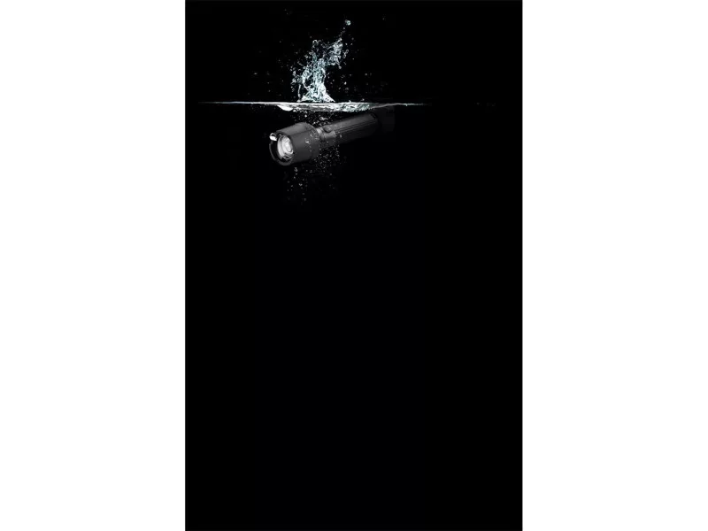 - Gumové obaly na hlave lampy a koncovom kryte chránia lampu pred nárazmi a zvyšujú priľnavosť; ochrana objektívu chráni objektív pred nárazmi a znečistením