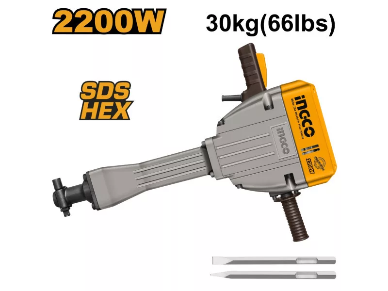 Az INGCO 2200 W teljesítményű bontókalapács nagy erejű, ipari felhasználásra tervezett szerszám, amely ideális beton, aszfalt és egyéb kemény építőanyagok bontásához. A nagy, 75 J ütési energia gyors és hatékony munkavégzést biztosít még a legkeményebb anyagok esetén is.