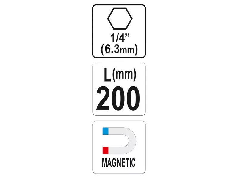 Magnetický držiak bitov značky Yato 1/4 x 200 mm. Vyrobený z ocele 40 Cr a dodatočný povrch bol zoxidovaný.