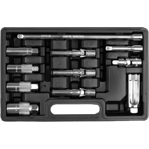 Set na demontáž a montáž štandardných zapalovacích, žiarových sviečok a lambda sondy. Obsahuje všetky potrebné nástavce a predlžováky prispôsobené pre väčšinu moderných vozidiel. Nástroje sú vyrobené z odolnej chromovo-vanadovej ocele (CrV), ktorá zaručuje odolnosť voči deformáciám a dlhú životnosť v dielňových podmienkach.