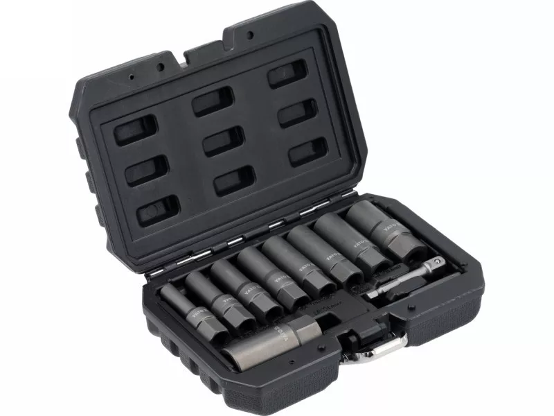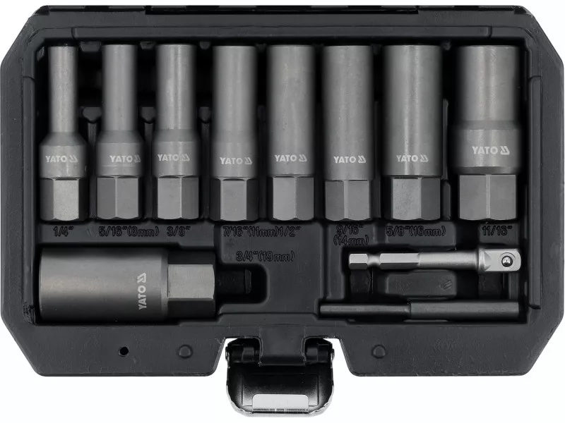 Súprava je prispôsobená na prácu s ratolesťami a kľúčmi 3/8" (9,5 mm), čo zabezpečuje stabilný prenos točivého momentu. Dlhé skrutkovače umožňujú dosiahnutie skrutiek, kolíkov a hriadeľov umiestnených v hlbokých zárezoch, skriniach a konštrukčných prvkoch, kde bežné nástroje nestačia. Rôzne pracovné veľkosti umožňujú prispôsobiť nástroj priemeru poškodeného prvku, čo zvyšuje účinnosť vyvŕtania a obmedzuje riziko ďalšieho poškodenia závitu.
