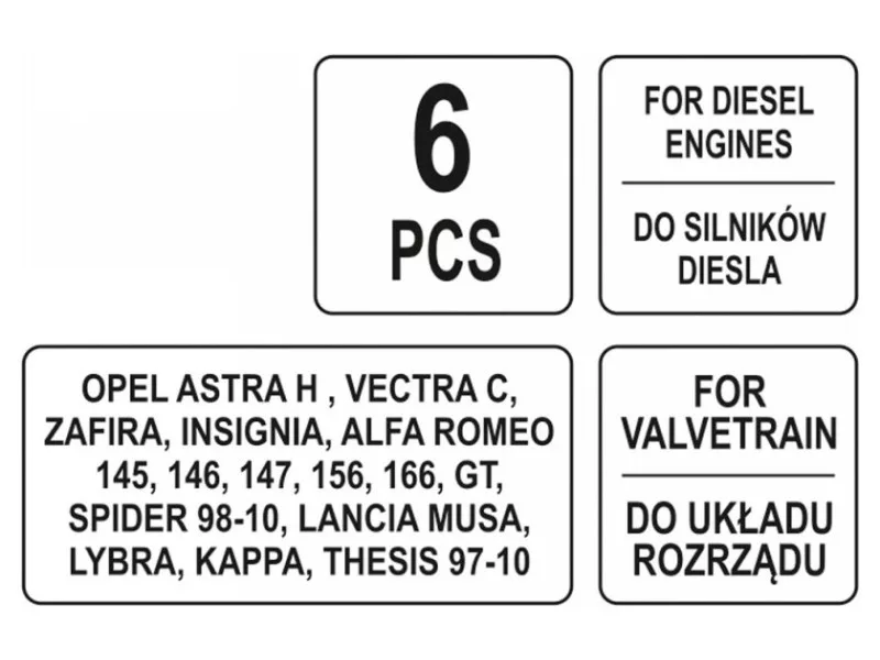 Profesionálna súprava časového zámku. Obsahuje 6 komponentov. Určená na servis vozidiel Opel, Fiat a Alfa Romeo.