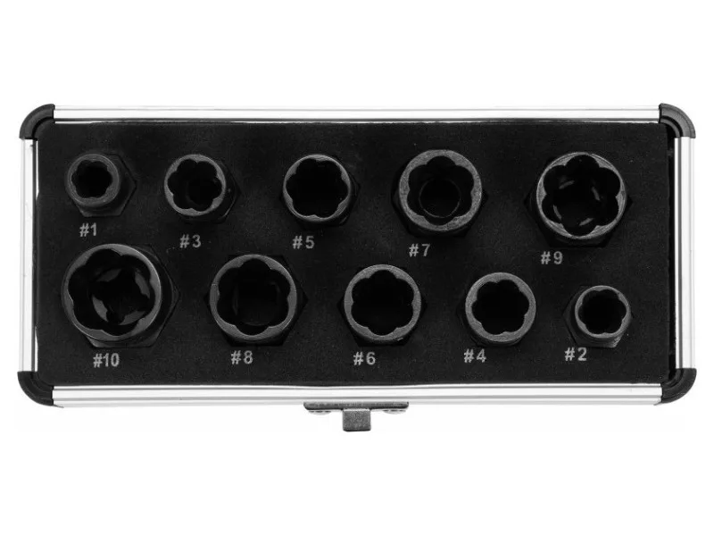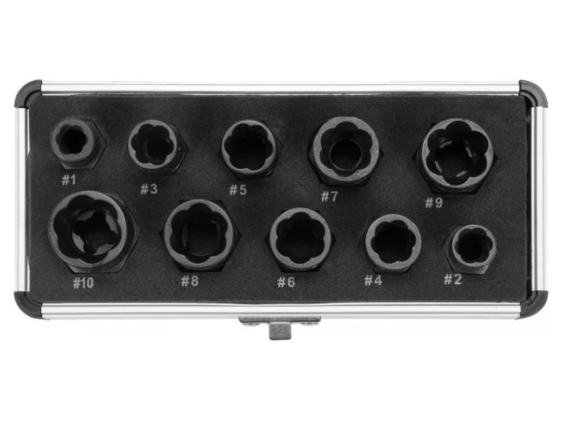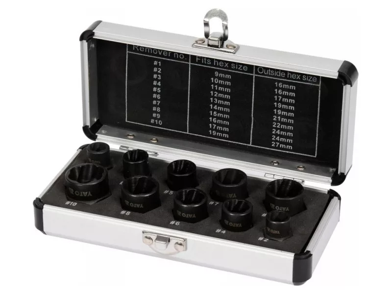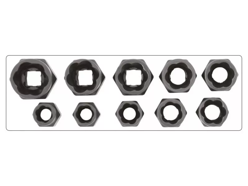 Zásuvky na poškodené, strojovo opracované skrutky, matice a skrutky s veľkosťou 9, 10, 11, 12, 13, 14, 15, 16, 17 a 19 mm majú špeciálny tvar, ktorý umožňuje ich zaklinenie na poškodenú skrutku alebo maticu, a tým odstránenie poškodenej časti.