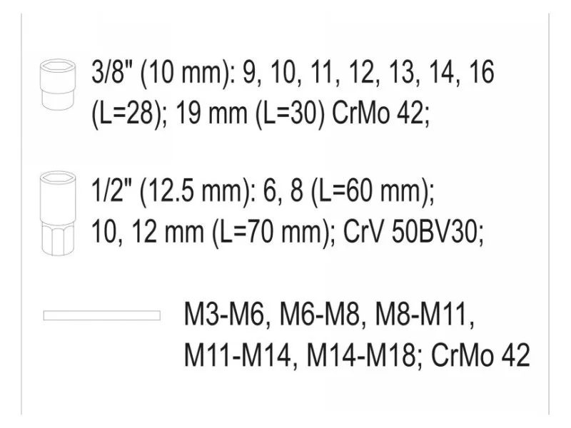 - 3/8" (10 mm): 9, 10, 11, 12, 13, 14, 16 mm (D = 28 mm); 19 mm (D = 30 mm)