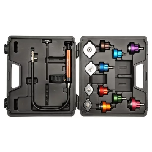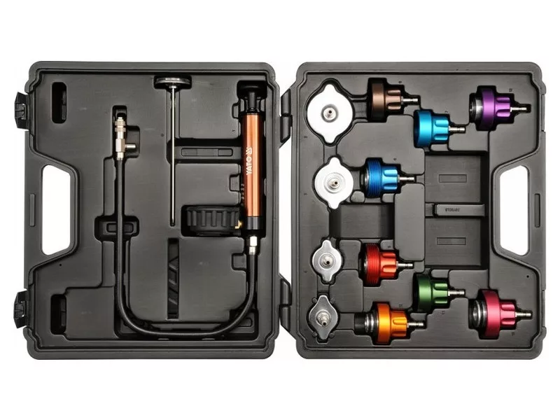 Profesionálna 14-dielna súprava na kontrolu tesnosti chladiacich systémov.