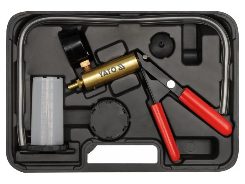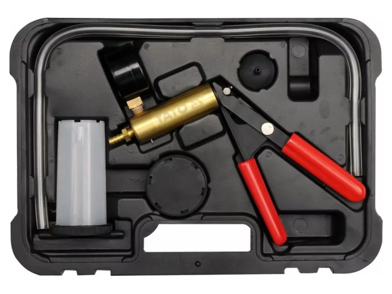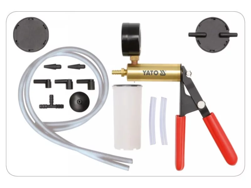 Vákuová pumpa je multifunkčné zariadenie na diagnostiku systémov v automobiloch a technológiách, ktorých činnosť je založená na tlaku alebo vákuu. Je vybavená príslušenstvom na použitie v takmer každom motore alebo systéme. Rozsah merania: -1 až 0 barov. Vývevu možno použiť na diagnostiku okrem iného týchto systémov a sústav: Počítačové zariadenia na riadenie motora: - Snímač barometrického tlaku (BARO) - Systém PCV - Systém recirkulácie výfukových plynov (EGR) - Snímače hrubého tlaku (MAP) Zariadenia na riadenie zapaľovania: - Podtlak predstihu zapaľovania - Zdržovací ventil: SDV, RCV Brzdový systém: - konvenčné brzdy - brzdy s ABS - vzduchové brzdy - brzdové potrubie - brzdový servosystém Ostatné systémy: - klimatizácia - tempomat - palivová nádrž a palivový systém - podtlakový systém zatvárania dverí Diagnostika systému recirkulácie výfukových plynov (EGR) Ventil systému EGR je príkladom ventilu ovládaného podtlakom. V prípade neprítomnosti podtlaku je ventil uzavretý a výfukové plyny z neho neunikajú. Ak sa na ventil privedie podtlak, otvorí sa a umožní recirkuláciu výfukových plynov. Diagnostika snímača tlaku v hrubej vrstve (MAP) - Zostavte systém čerpadla a nádržky ako pri odvzdušňovaní brzdových strmeňov, potom ho pripojte k podtlakovej prípojke snímača. - Stláčajte páčku čerpadla, kým ukazovateľ neukazuje -0,5 baru. Dokončite čerpanie a pozorujte ukazovateľ, mal by byť v pokoji. Ak sa ukazovateľ pohybuje, znamená to chybný snímač MAP. - Počas prevádzky vysiela snímač MAP spätné signály do riadiaceho počítača. Signál má frekvenciu od 85 Hz do 160 Hz v závislosti od úrovne podtlaku. Na meranie frekvencie je potrebný merač frekvencie, pripojte ho v súlade s návodom na použitie snímača a merača. Odvzdušnenie brzdových strmeňov - Uistite sa, že expanzná nádržka brzdového systému je naplnená kvapalinou na menovitý objem. - Odvzdušnenie vykonajte v nasledujúcom poradí: - Hlavný brzdový valec, ak je vybavený odvzdušňovacím ventilom - Brzdové strmene v poradí od najbližšieho k hlavnému brzdovému valcu po najvzdialenejší - Pripojte krátku flexibilnú hadicu k prípojke umiestnenej na spodnej strane krytu nádrže čerpadla. - Uzavrite nádržku čerpadla krytom. - Pripojte dlhé hadice k prípojkám na kryte. Koniec jednej z dlhých hadíc pripojte k čerpadlu a druhý k odvzdušňovaciemu ventilu (strmeňu) brzdového strmeňa. V prípade potreby použite adaptér. - Stlačte páku čerpadla 10 - 15-krát, aby sa v nádržke čerpadla vytvoril podtlak. - Uvoľnite odvzdušňovací ventil o 1/4 - 1/2 otáčky tak, aby sa nádržka čerpadla naplnila kvapalinou do výšky približne 5 cm. Utiahnite odvzdušňovací ventil. - Odpojte potrubie čerpadla od odvzdušňovacieho ventilu, postup odvzdušnenia svorky je teraz ukončený. - Pred zopakovaním postupu odvzdušnenia ďalšieho strmeňa vyprázdnite nádržku čerpadla s brzdovou kvapalinou a doplňte hladinu brzdovej kvapaliny v brzdovom systéme na menovitú úroveň.