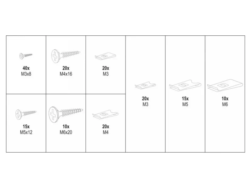 Nastavte obsahskrutky x85 (M3x8 mm x40, M4x16 mm x20, M5x12 mm x15, M6x20 mm x10), podložky x85 (M3 x40, M4 x20, M5 x15, M6 x10)