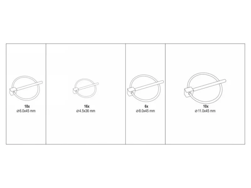 | Nastavte obsah | závlačky s krúžkom x50 (Ø4,5x36 mm x16, Ø6x45 mm x18, Ø8x45 mm x6, Ø11x45 mm x10) |