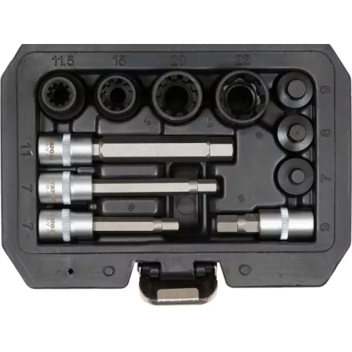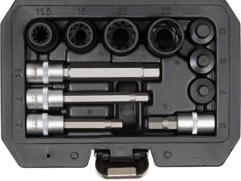 | Nastavte obsah | šesťhranný nástrčný kľúč 3/8” x4 (7 mm x 2, 9 mm, 11 mm), špeciálna šesťhranná objímka 3/8” x3 (7 mm, 8 mm, 9 mm), |