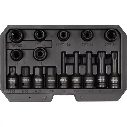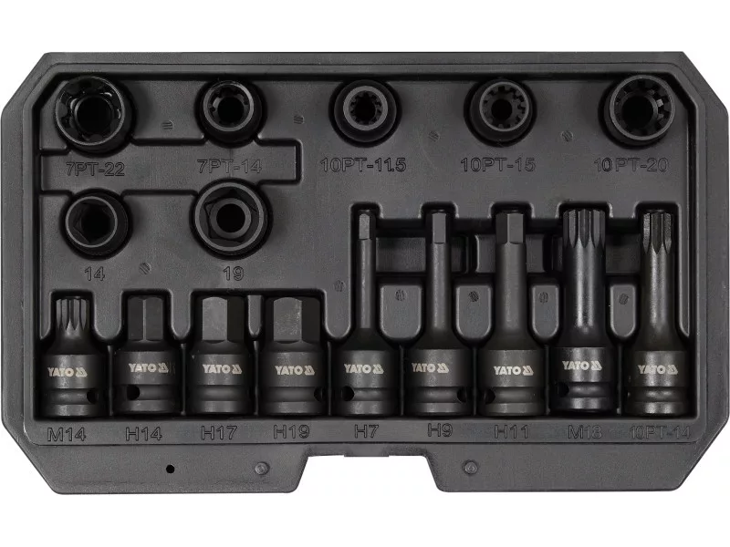 | Nastavte obsah | špeciálna päťuholníková objímka 1/2” x2 (5-bodová: 14 mm, 19 mm), Zásuvka 1/2" x5 (7-bodová: 14 mm, 22 mm; 10-bodová: 11,5 mm, 15 mm, 20 mm), |