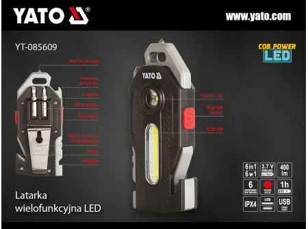 - 6 režimov svietenia: 400 lm (LED turbo), 200 lm (LED vysoký), 50 lm (LED nízky), 120 lm (COB vysoký), 35 lm (COB nízky), červeno-modré blikajúce svetlo