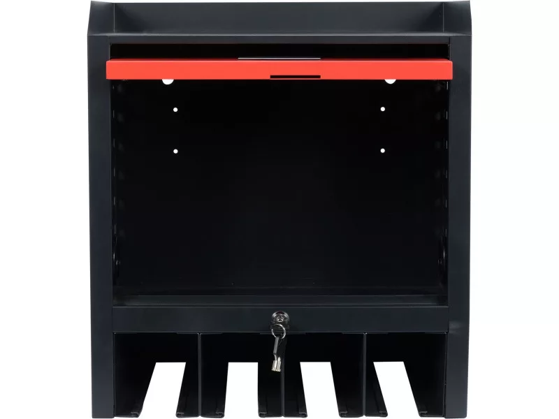 Uzamykateľná skriňa na uloženie dielenského náradia. Nad skriňou je horná polica a pod skriňou je polica so 4 vreckami na zavesenie náradia.