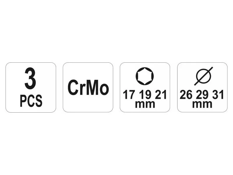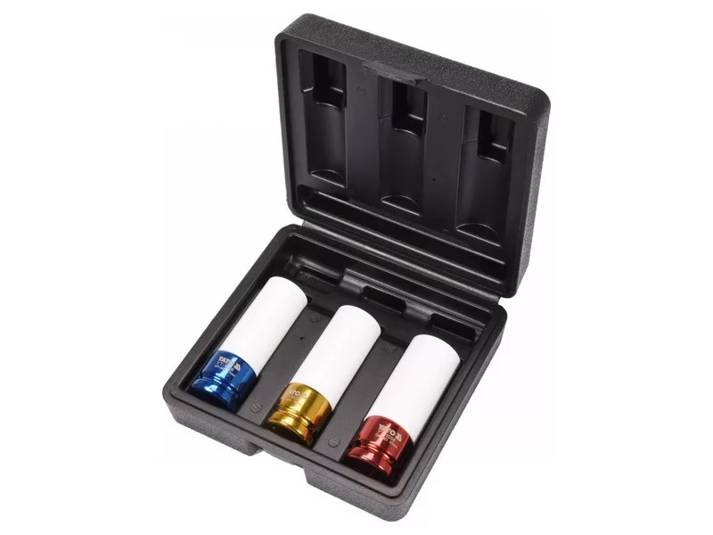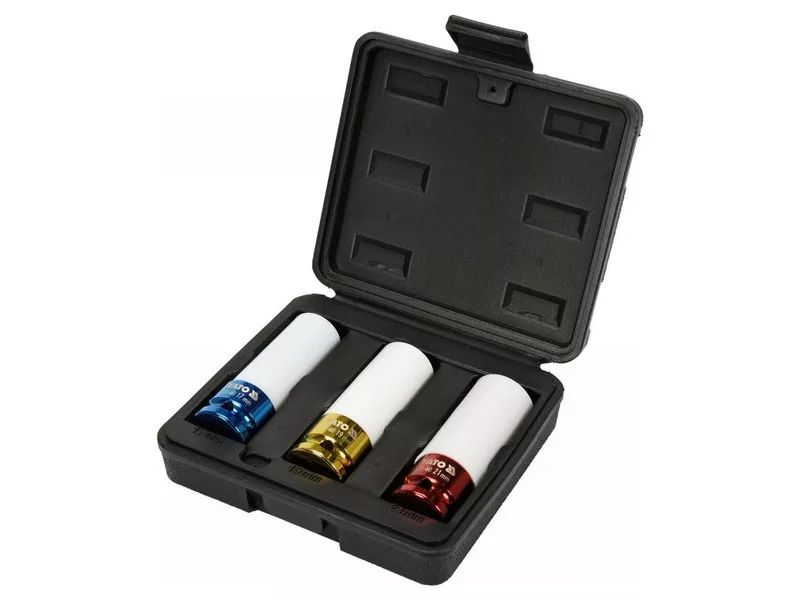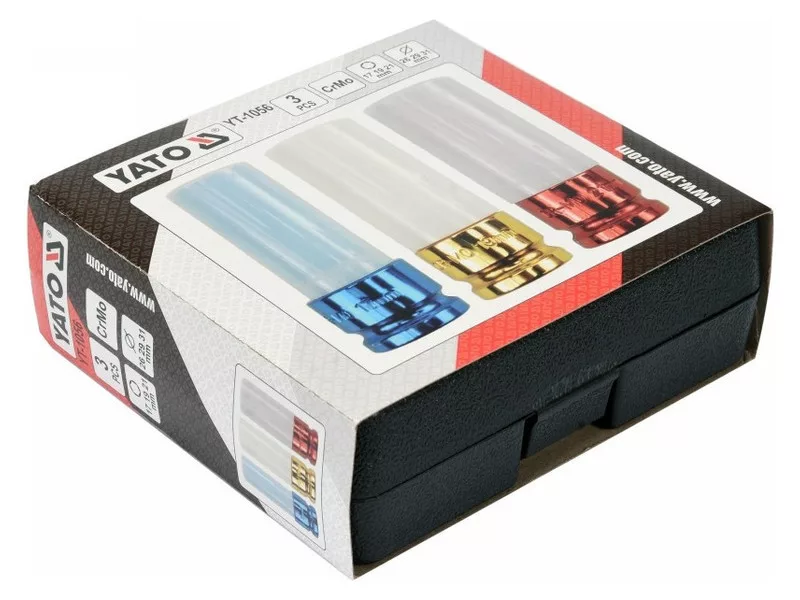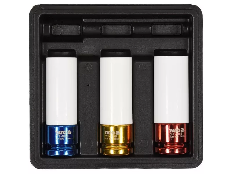Rázové nástrčné hlavice značky YATO vyrobené z chróm-molybdénovej ocele s označením SCM-440. Majú mäkké plastové bezpečnostné puzdro, ktoré chráni ráfik pred poškodením laku.