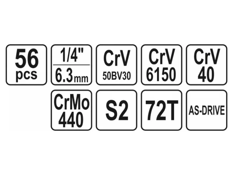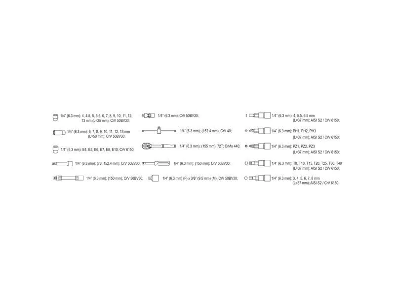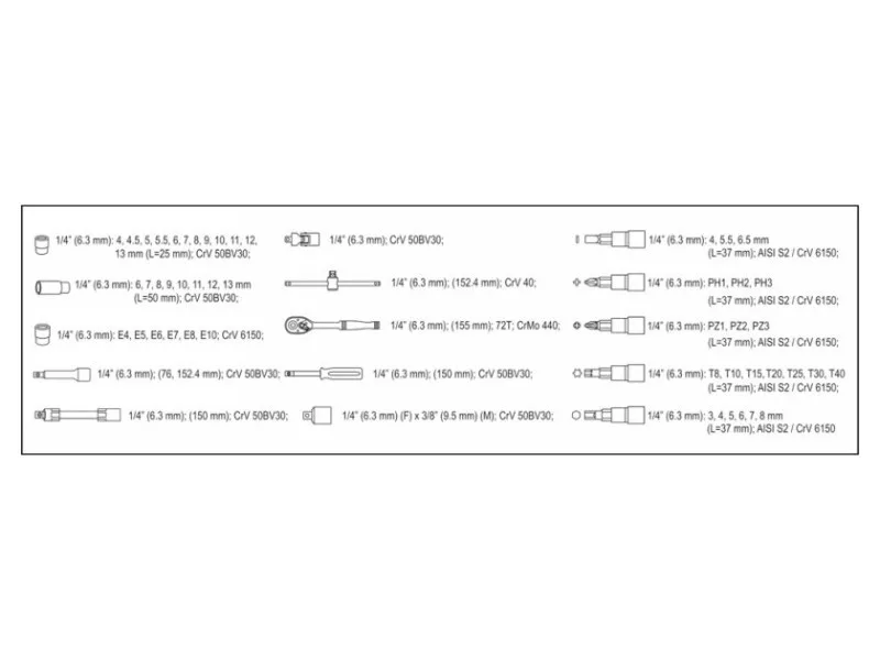 Profesionálna súprava nástrojov, ktorá bola vyvinutá na uspokojenie potrieb špecializovaných automobilových a mechanických služieb. Nástrčné kľúče, ako aj nástrčný pohon boli vyrobené z robustnej chróm-vanádiovej ocele CrV 50BV3.