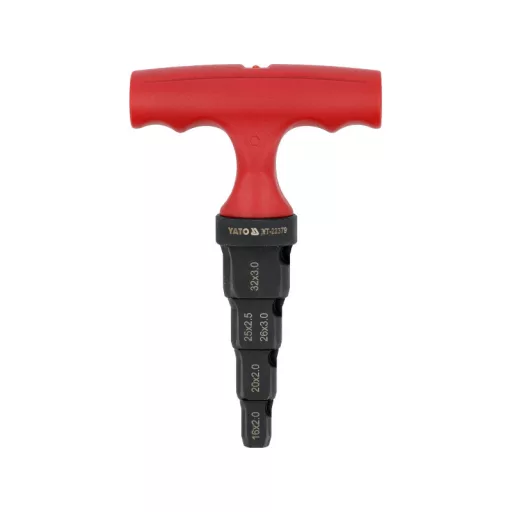 Profesionálny kalibrátor s gratónikom určený na prípravu viacvrstvových rúr pred inštaláciou spojovacích prvkov. Nástroj umožňuje kalibráciu a odstránenie ostrých hrán vzniknutých počas rezania, čo zabezpečuje správne usadenie tvaroviek a tesnosť inštalácie.