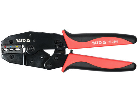 YT-2246 szigetelt csatlakozók préselésére szolgáló fogó, korrozió megelőzése érdekében feketedett felülettel és két-komponensű műanyag markolata van. A keményebb PP komponens, amely közvetlenül az eszközre van szerelve, szorosan illeszkedik a testhez, míg a TPR külső rész kellemes tapintású és csúszásgátló tulajdonságokkal rendelkezik. A rácsos mechanizmus gyors és pontos préselést tesz lehetővé túlzott erő kifejtése nélkül.
