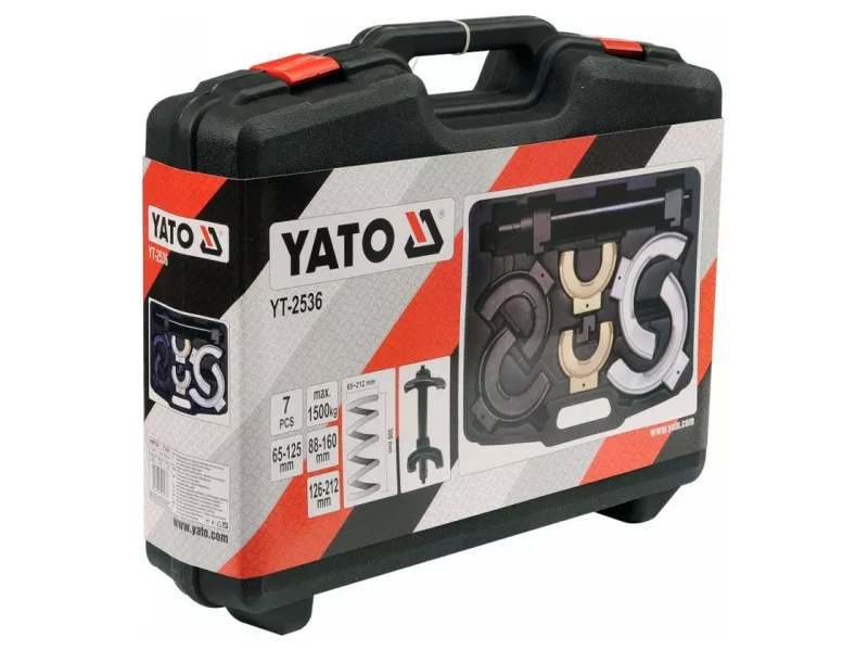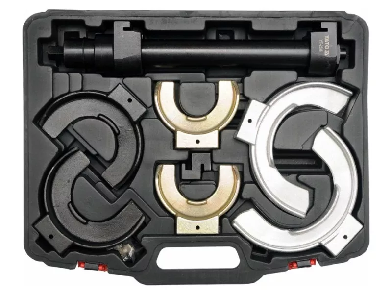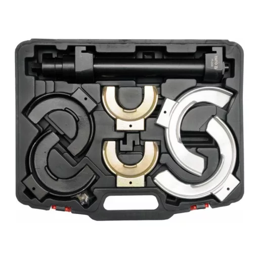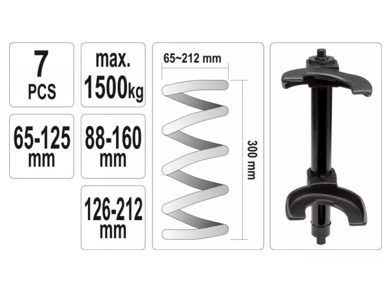 Profesionálny sťahovák pružín McPherson s vymeniteľnými rukoväťami. Súprava 7 dielov. Súprava je určená na výmenu tlmičov v zavesení typu McPherson. Sťahovák má vymeniteľné rukoväte, čo umožňuje manipuláciu s pružinami s priemerom od 65 mm do 212 mm. Materiál: zliatina CrMo SCM415, fosfátovaný povrch. Jednoslúpikový sťahovák s priemerom rúrky 45 mm. Pohon: 21 mm skrutka s jemným lichobežníkovým závitom. Trojbodové nastaviteľné rukoväte prispôsobené zakriveniu pružiny. Nastaviteľné v rozsahu: Celková dĺžka 400 mm (výška pružiny 300 mm): 1500 kg.