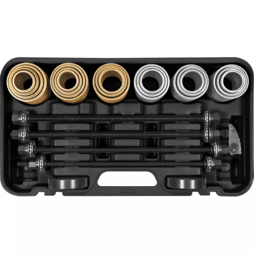 Sada 20 puzdier na lisovanie/vkladanie kovových/pryžových puzdier do vozidla bez nutnosti demontáže riadiacich ramien alebo nosníkov.