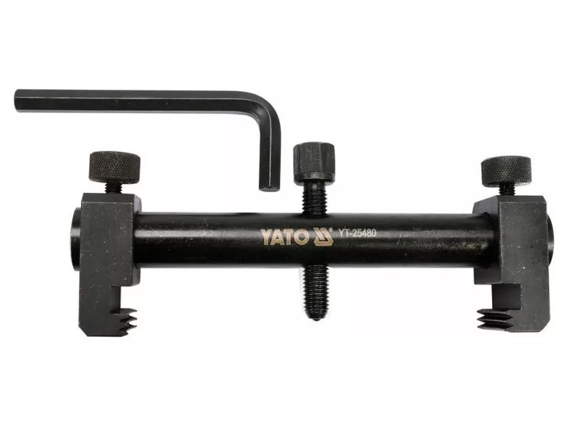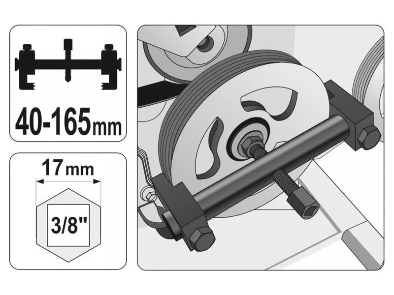 Profesionálny sťahovák pre viacnásobné remenice s V-rebrovaním a viacnásobné remenice s V-rebrovaním, alternátory, klimatizačné jednotky, vodné čerpadlá, kľukový hriadeľ atď. Rozsah spracovávaných priemerov do 165 mm. Má presné zárezy na ramenách - zaistené špeciálnymi skrutkami. - malé rozmery umožňujú prácu na ťažko prístupných miestach - zárezy na pätkách vretena zodpovedajú drážkam na kolese, aby sa zabránilo jeho poškodeniu - sťahovák vretena vyrobený z kalenej, tvrdenej ocele - pracovný rozsah 40 mm - 165 mm - pätky vretena stlačené a zaistené gombíkmi - imbusový kľúč na zaistenie ramien je súčasťou dodávky Automobilové dielne, priemysel - sťahovák vretena - imbusový kľúč