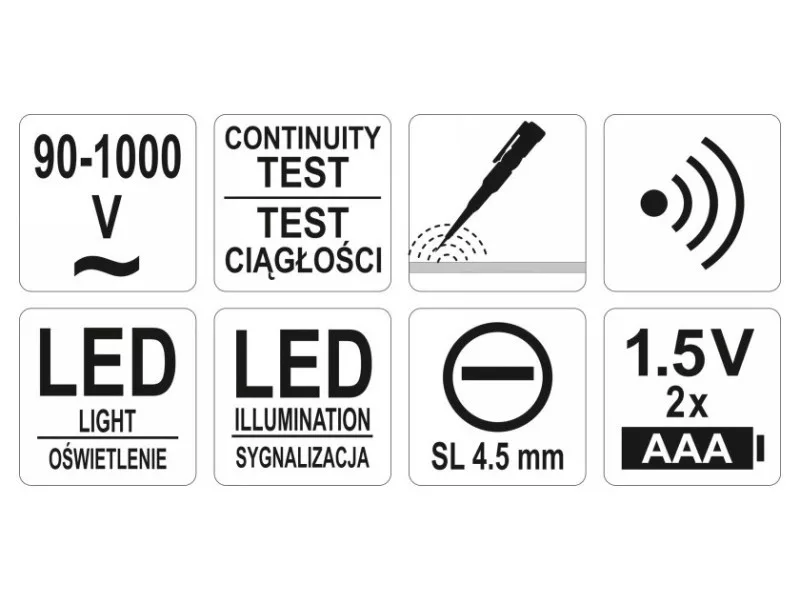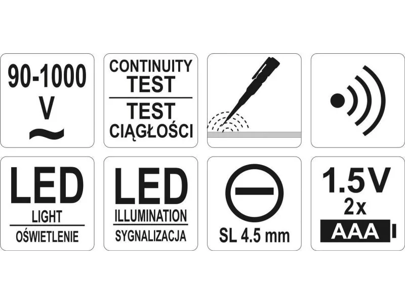 Indukčný tester určený na detekciu napätia v elektrických kábloch v rozsahu 90 - 1000 V. Okrem toho umožňuje test spojitosti vodičov.