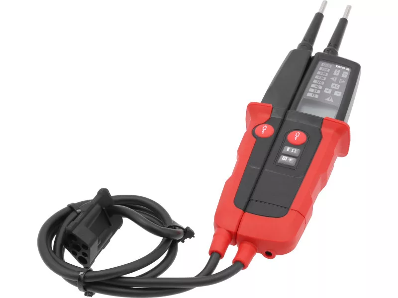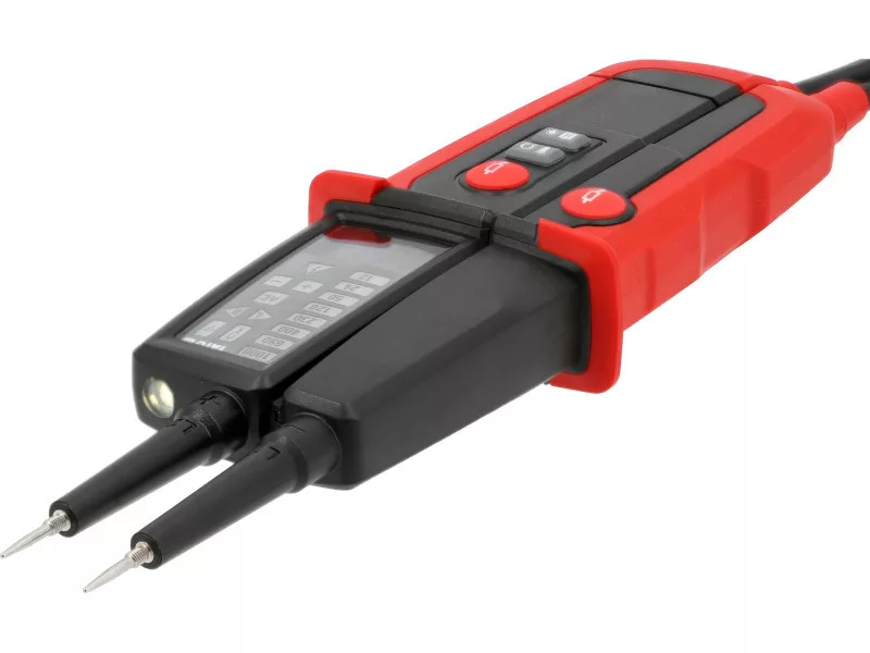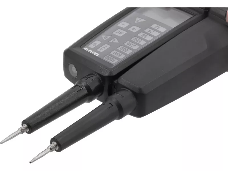 Dvojpólový tester napätia v pevnej skrinke s flexibilnými káblami v silikónovej izolácii. Detekuje a meria napätie AC a DC v rozsahu od 6 do 1000 V. Výsledok je zobrazený na LCD displeji a pomocou LED kontroliek. Tester tiež umožňuje: