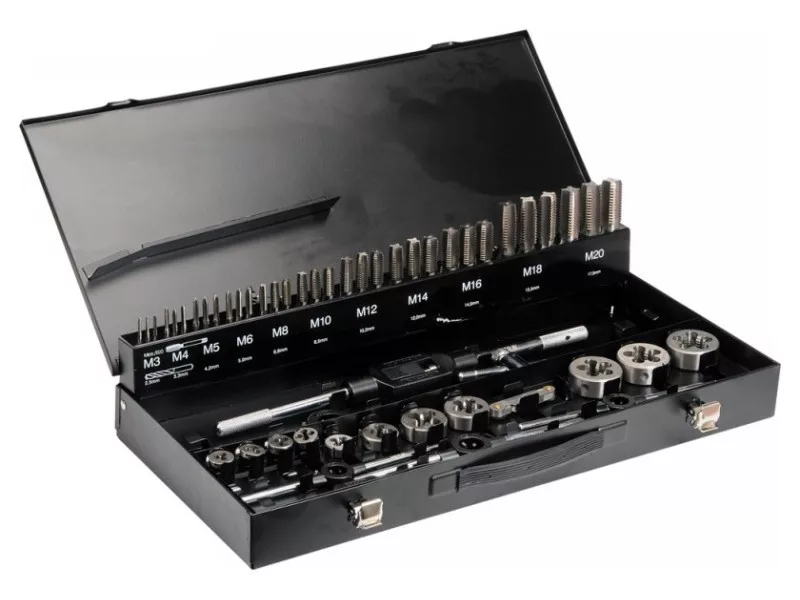 | Nastavte obsah | ručný závitník (predbežný závitník, odstraňovač, finišer) x33 (M3x0,5 mm, M4x0,7 mm, M5x0,8 mm, M6x1 mm, M8x1,25 mm, M10x1,5 mm, M12x1,75 mm, M14x2 mm, M16x2 mm , M18x2,5 mm, M20x2,5 mm), |