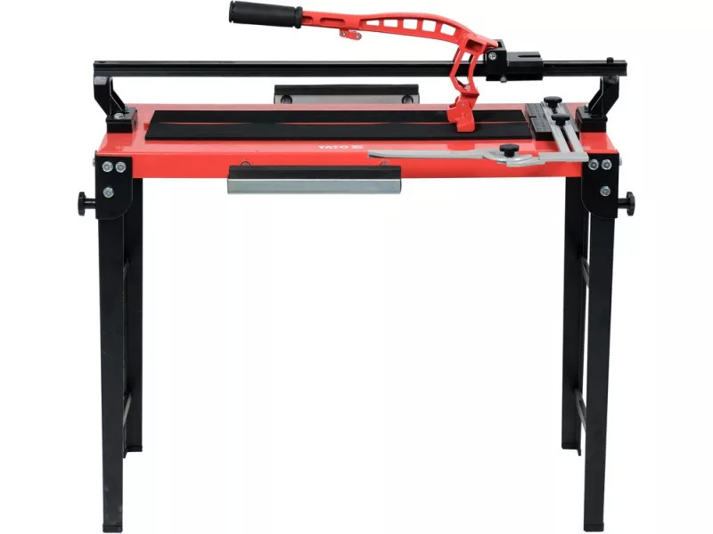 Rezačka dla dla dláždíc s dĺžkou 600 mm, spojená so oceľovým stolom s rozkladacími nohami, vyloženým tvrdou technickou penu.