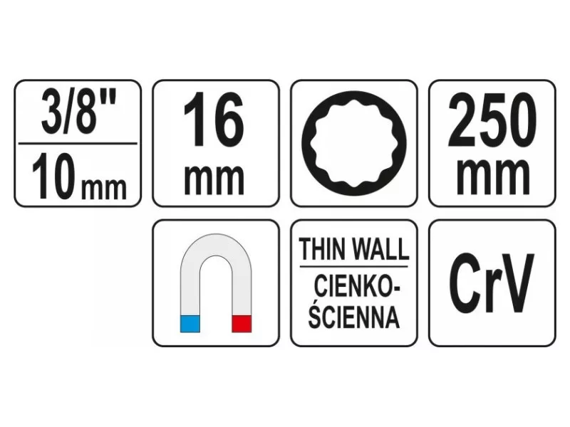 12-uholníková zásuvka na inštaláciu a demontáž zapaľovacích sviečok. Jej dĺžka umožňuje prácu v stiesnených priestoroch v hlave motora. Odporúča sa na použitie v automobilových dielňach.