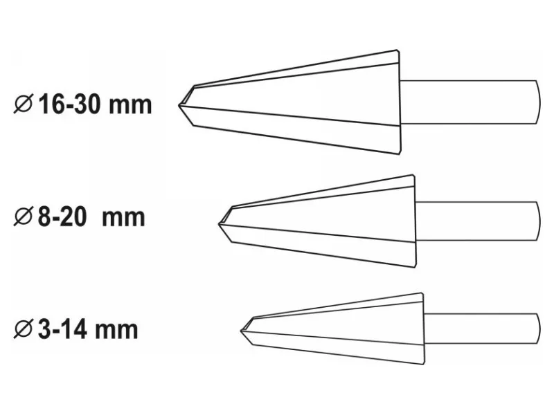 | Nastavte obsah | kužeľový vrták x3 (Ø3-14 mm, Ø8-20 mm, Ø16-30 mm) |