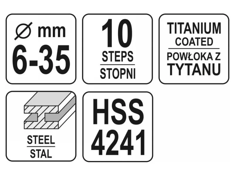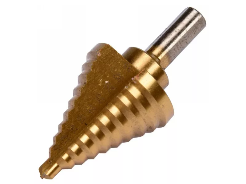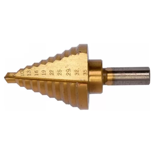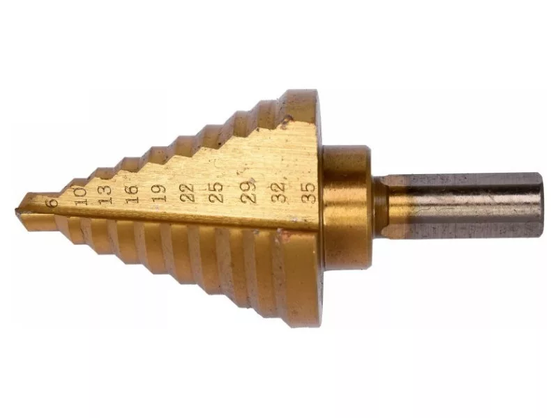 Stupňovitý vrták určený na vŕtanie do vysokokvalitnej nehrdzavejúcej, konštrukčnej a za studena valcovanej ocele, neželezných kovov, oceľových plechov, plastov.