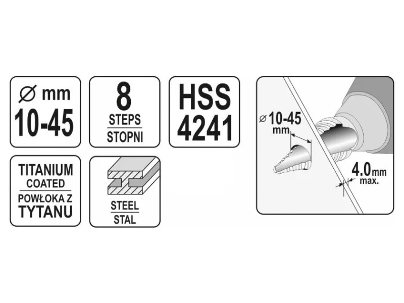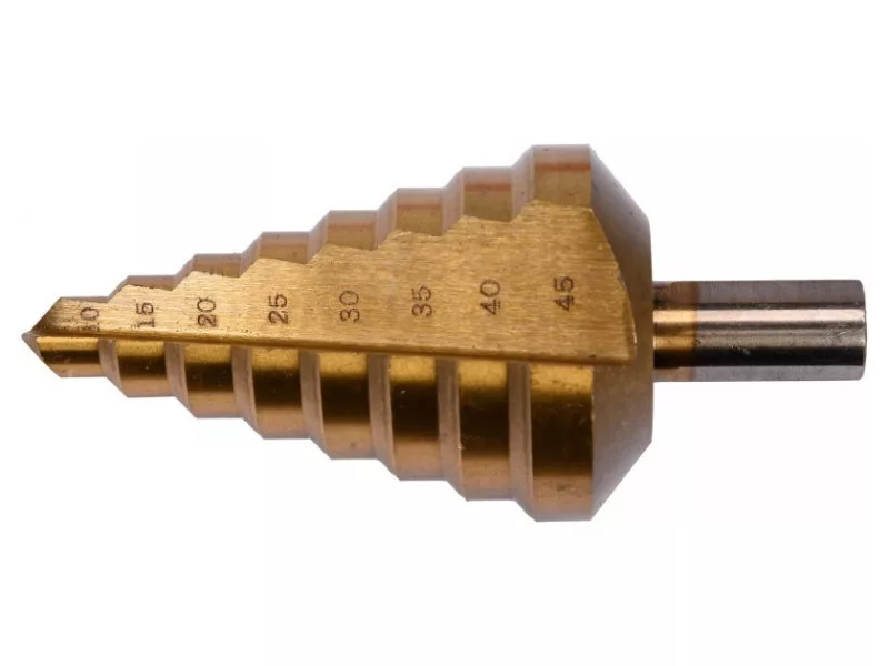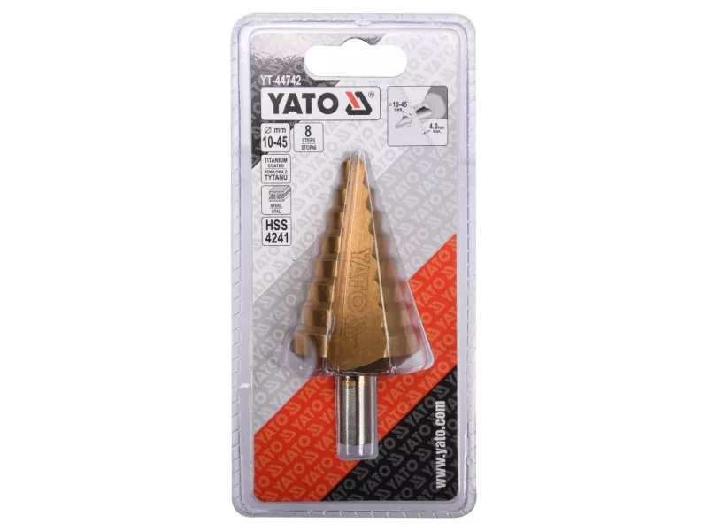 YATO Stupňový vrták 10-45 mm 8 stupňov HSS nitrid titánu YATO Stupňový vrták 10-45 mm 8 stupňov HSS nitrid titánu YATO Stupňový vrták 10-45 mm 8 stupňov HSS nitrid titánu