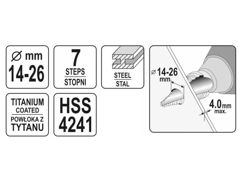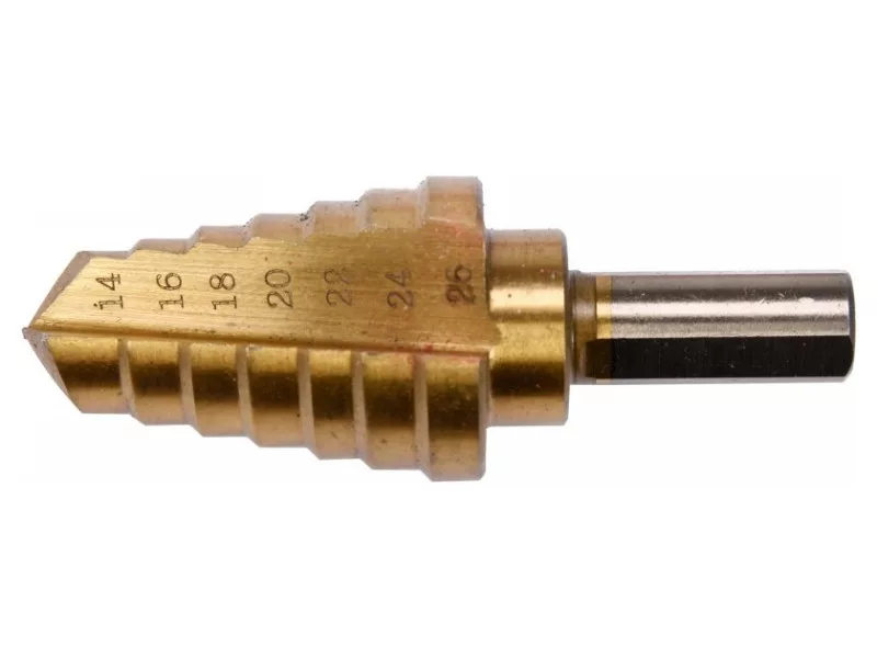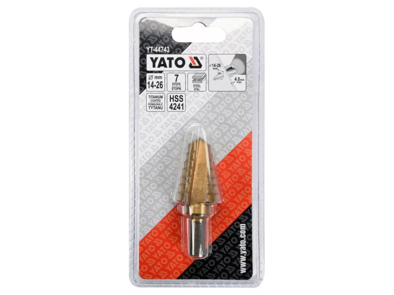 YATO Stupňový vrták 14-26 mm 7 stupňov HSS nitrid titánu YATO Stupňový vrták 14-26 mm 7 stupňov HSS nitrid titánu YATO Stupňový vrták 14-26 mm 7 stupňov HSS nitrid titánu