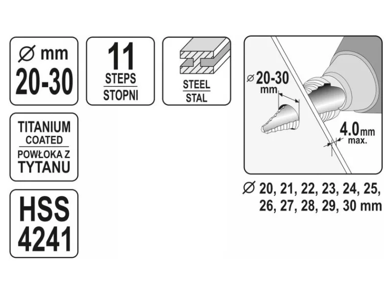 Stupňovitý vrták určený na vŕtanie do vysokokvalitnej nehrdzavejúcej, konštrukčnej a za studena valcovanej ocele, neželezných kovov, oceľových plechov, plastov.