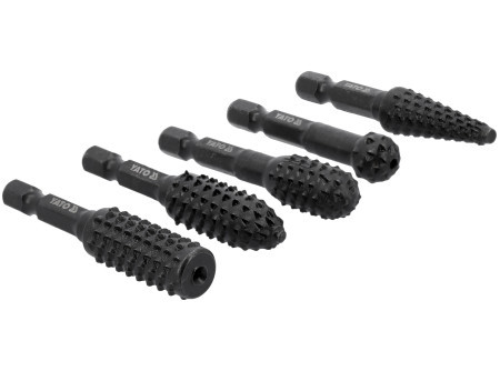 Feketés szénacélból készült forgó reszelő készlet. Faipari munkáknál, ajtózárszerelésnél lyukak bővítésénél, asztalos illesztésekhez és élek lekerekítéséhez használják.