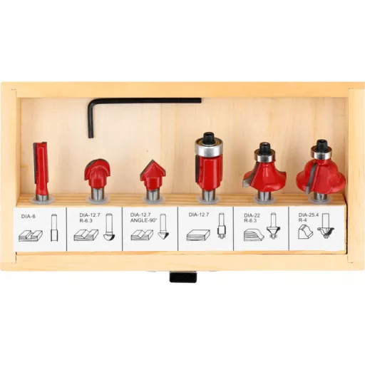 Sada 6 fréz na obrábanie dreva a niektorých plastov pomocou frézy so stopkou fi 6 mm. Tri z fréz na hrany sú zakončené ložiskom na jednoduché vedenie nástroja. Balené v drevenom kufríku.