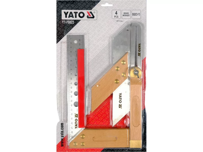 Nastavte obsahuhol 90˚ (L=250 mm), nastaviteľný uhol (L=250 mm), diagonálny uhol 45˚, 135˚ (L=235 mm), tesárska ceruzka (L=180 mm)