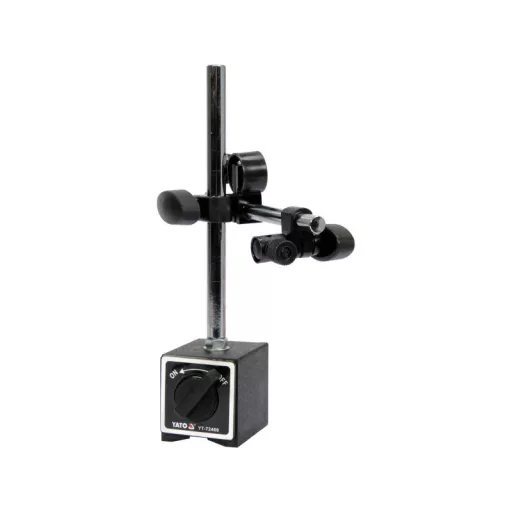 Profesionálny magnetický stojan YT-72460 pre číselníkové meradlá YT-72450 a YT-72453. Má pružinový kĺb na presné umiestnenie číselníkového meradla na meraný diel. Centrálna aretácia stredného a horného kĺbu súčasne pomocou gombíka. Magnetická základňa s prizmatickou drážkou na spodnej strane. Vysoká ťažná sila zabezpečuje stabilné a bezpečné pripojenie ku kovovým súčiastkam - uvoľnenie súčiastky sa dosahuje špeciálnym gombíkom.
