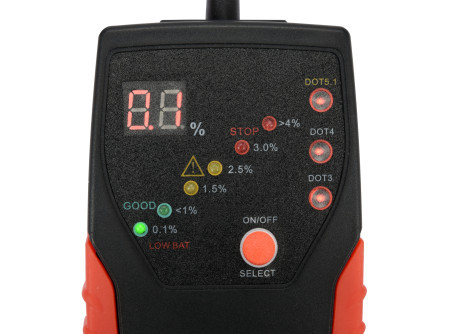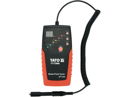 Profesionálny tester brzdovej kvapaliny s číslom YT-72985 je kompatibilný s kvapalinami DOT3, DOT4, DOT5.1. Je vybavený LCD displejom a 6 diódami. Výstražný signál sa aktivuje, keď obsah vody v brzdovej kvapaline prekročí 3%. Flexibilná sonda s káblom dlhým 180 cm poskytuje pohodlný prístup k nádržkám brzdovej kvapaliny.