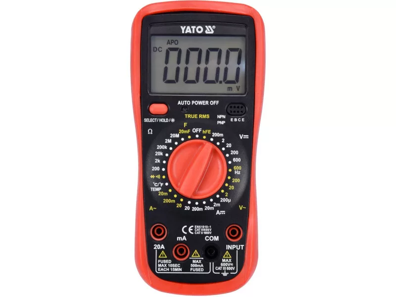Viacúčelový merací prístroj YT-73083 s funkciou TRUE RMS a manuálnym rozsahom pre každé meranie umožňuje vykonávať základné a pokročilé elektrické merania. Meranie striedavého a jednosmerného prúdu až do 20 ampérov odlišuje multimeter od iných zariadení a vďaka veľkému displeju s modrým podsvietením bude výsledok viditeľný aj za sťažených svetelných podmienok.