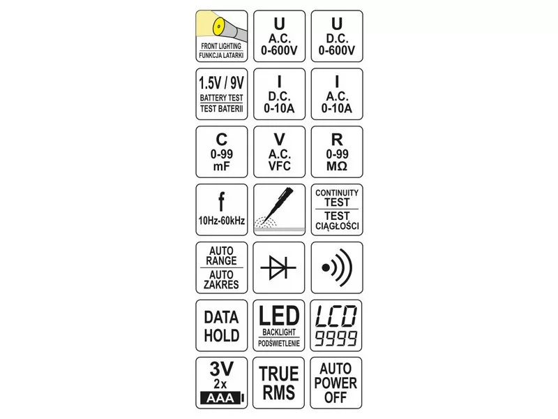 Univerzálny merací prístroj YT-73094 s funkciou TRUE RMS a automatickým rozsahom pre každé meranie umožňuje vykonávať základné aj pokročilé elektrické merania. Ďalšou a užitočnou možnosťou je možnosť bezkontaktnej detekcie striedavého napätia, ako aj detekcie fázového vodiča cez izoláciu. Pomocou testu 1,5 V a 9 V batérie môžeme skontrolovať napätie batérie pri zaťažení, to pomôže posúdiť jej stav a vylúčiť alebo potvrdiť potrebu výmeny.