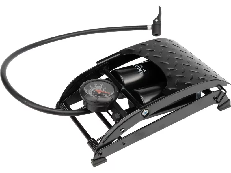 Dvojpiestové nožné čerpadlo robustnej konštrukcie, vyrobené z 3 mm hrubého reliéfne lakovaného oceľového plechu. Tlakomer s údajom do 7 barov - dvojpiestová nožná pumpa - adaptéry - 2 ks. (na čerpanie matracov, lôpt atď.).
