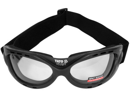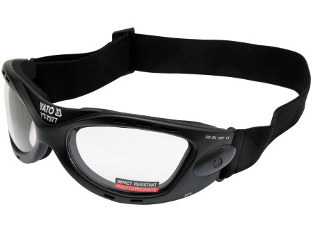 Védőszemüveg YT-7377, szemüveghez hasonló keretkialakítással, tökéletesen illeszkedik az arcra. A szemüveg nem csak az elől felől, hanem szinte minden irányból védi a szemet, ezért ajánlott poros körülmények között dolgozni (pl. gittel kézi csiszolás) és olyan helyzetekben, ahol nem tudjuk előrejelezni a munkadarab irányát (pl. fűrészelt fa vágása vagy róka farok eszközzel).Optikai osztály: 1 - legmagasabb minőségű látómező, folyamatos munkavégzésre ajánlott lencse anyaga: polikarbonát keret anyaga: nylon + állítható rugalmas szíj habos gumi alapú szemüveg belül, a tökéletes illeszkedés érdekében az arcra az üveg ovális kialakítása széles látószöget biztosít a szellőzőnyílások csökkentik a szemüveg belső párolgását A szemüveg F szintű mechanikai szilárdsággal rendelkezik, vagyis képes ellenállni egy 6mm átmérőjű, 0,86g súlyú és 45m/s sebességű acélrészlet ütésének. Megfelel az EN166 szabványnak.