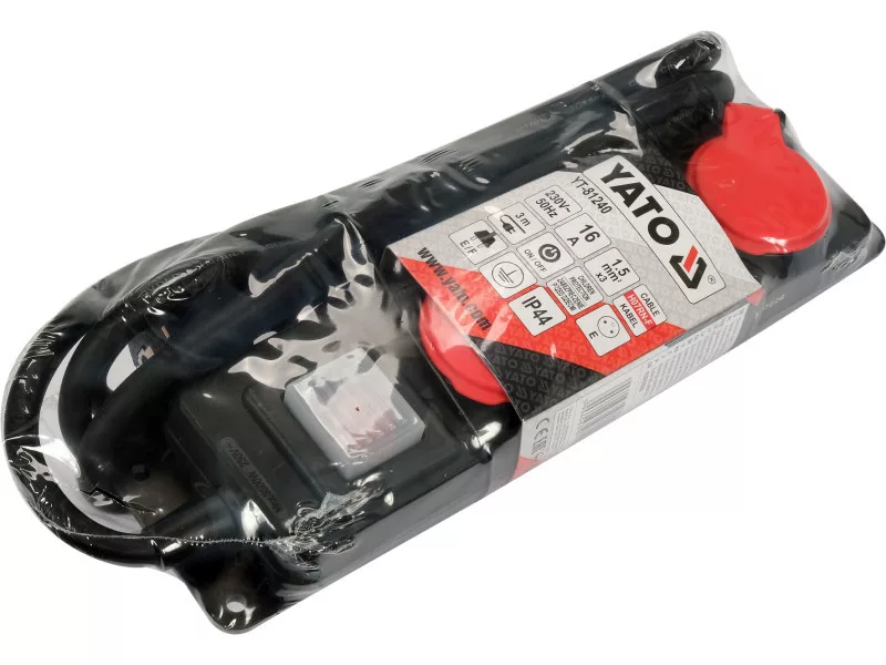 YT-81240 predlžovací kábel vo forme lišty s tromi uzemnenými zásuvkami. Vďaka hrubému a pevnému káblu v neoprénovom gumovom plášti je predlžovací kábel vhodný na použitie v interiéri aj exteriéri, napr. v garáži, na stavenisku, v záhrade alebo na dvoroch pred továrňami. Vzduchotesný a robustný kryt a výklopné kryty zásuviek zabezpečujú konštrukciu odolnú proti striekajúcej vode a prachu, zatiaľ čo špeciálne montážne otvory umožňujú zavesenie predlžovacieho kábla napríklad na stenu.