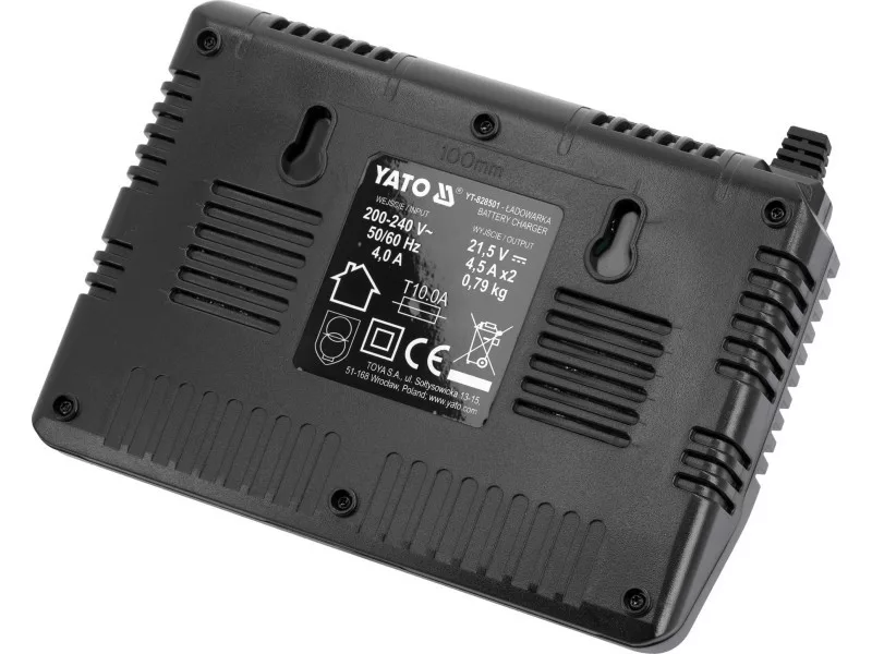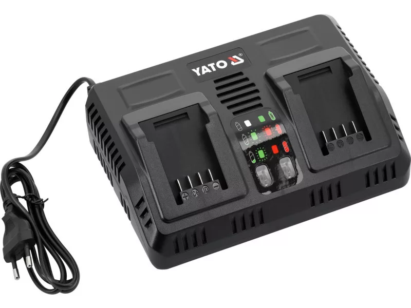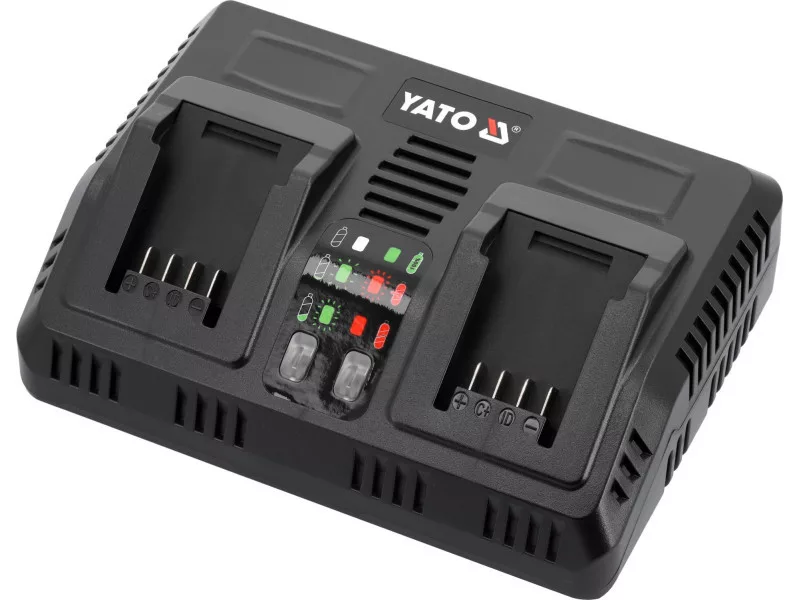 Rýchla duálna nabíjačka pre všetky 18 V systémové akumulátory YATO. Zabudovaný systém testovania výkonu a teploty akumulátorov sa stará o ich životnosť. Nezačne nabíjať, keď sú články príliš horúce. V prípade akumulátora uloženého pri zápornej teplote začne nabíjať, keď akumulátor dosiahne teplotu vyššiu ako +5 stupňov Celzia.